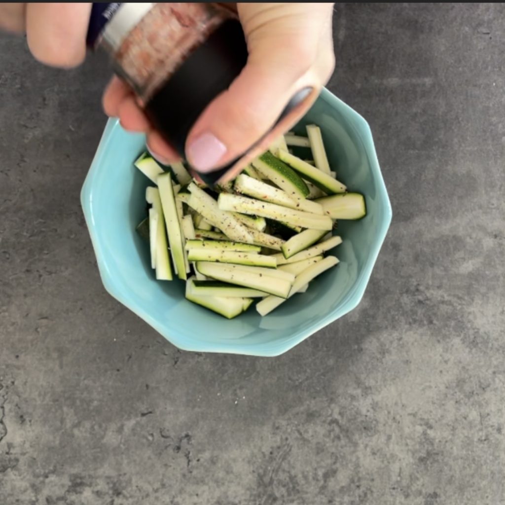 leg een vel geperforeerd papier op de bodem van het mandje van je airfryer en verdeel de courgettes er goed over. Bak op 200°C gedurende 10 minuten, open halverwege de baktijd het mandje en roer de courgettes zodat ze goed goudbruin worden.