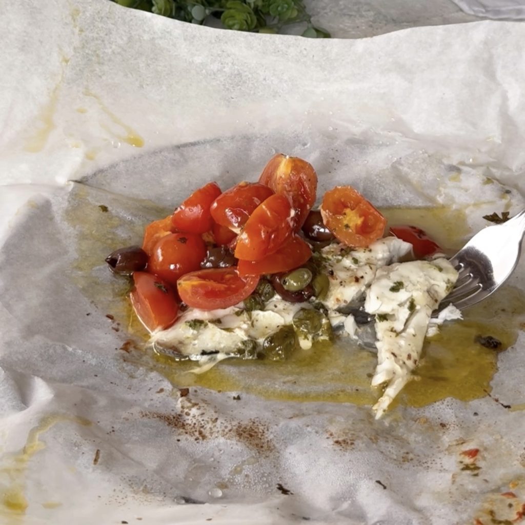 Zeedorf in de oven in papieren zakje is een hoofdgerecht dat gemakkelijk te maken is en perfect voor elke gelegenheid, zelfs de meer belangrijke. De zeedorf in papieren zakje met cherrytomaatjes, olijven en kappertjes kun je zowel met verse als bevroren zeedorffilets bereiden. De zeedorf in de oven in papieren zakje blijft dankzij de kookwijze zacht en niet droog; om het zakje te maken kun je simpelweg bakpapier gebruiken zoals ik heb gedaan of speciale zakjes die geschikt zijn voor dit type koken. De zeedorf in de oven in papieren zakje kun je van tevoren bereiden en opwarmen bij het serveren, of je kunt de zeedorf al voorbereiden en in het zakje sluiten, in de koelkast bewaren en kort voor het serveren bakken. Laten we nu kijken hoe we zeedorf in een papieren zakje in de oven kunnen maken en als je het probeert, laat het me weten. Barbara
