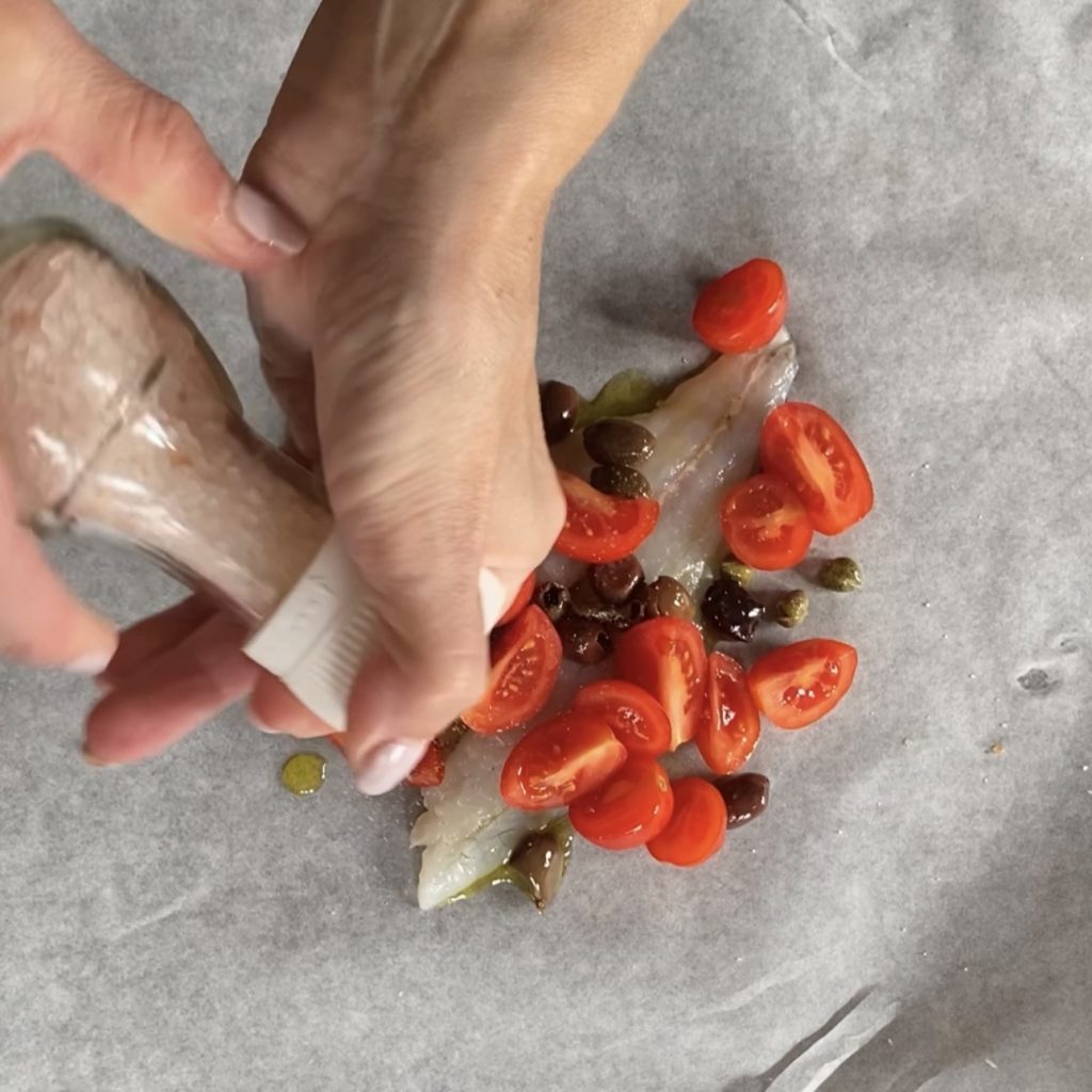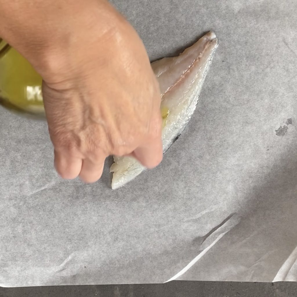 • Neem een stuk bakpapier en leg het op het werkblad, plaats het zeedorffilet in het midden en voeg wat extra vergine olijfolie toe,