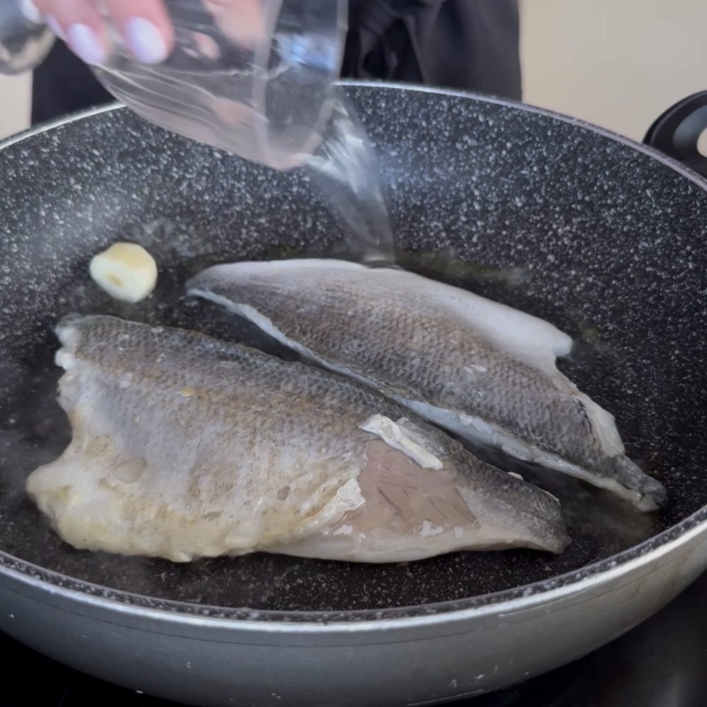 voeg de zeeduivelfilets toe, eerst met de huid naar de pan gericht, en bak een paar minuten aan elke kant