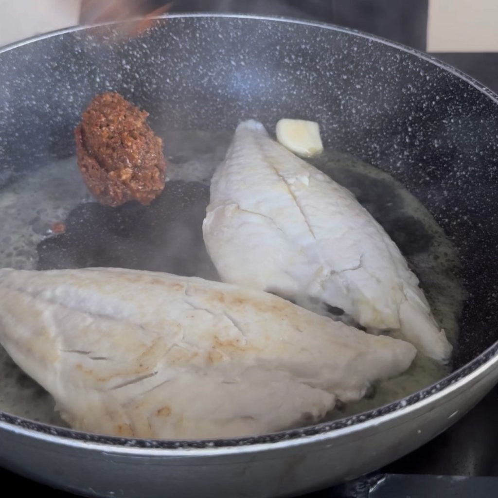 Begin met het bereiden van de zeeduivelfilets in de pan met gedroogde tomaten, pers het sap van een halve citroen,