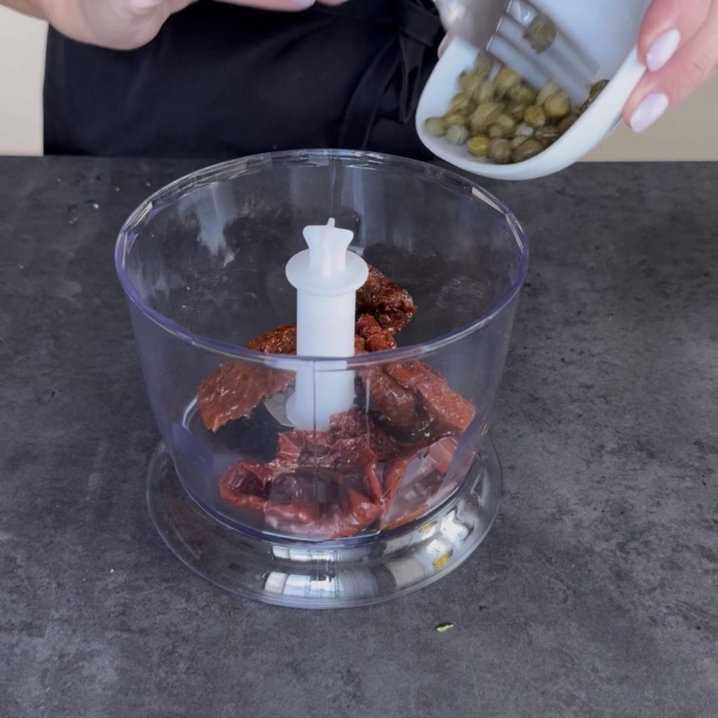 voeg de crème van gedroogde tomaten toe bovenop de filets en een snufje peterselie.