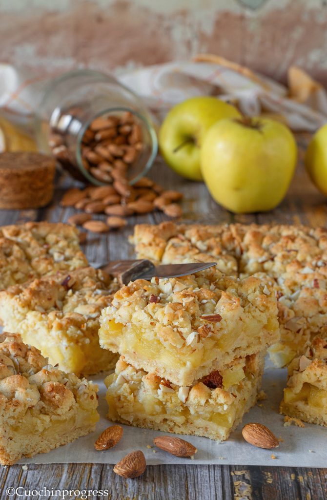 Zet op het vuur en laat 15 minuten zachtjes koken. Wanneer het vocht ingekookt is, zet je het vuur uit en laat je alles afkoelen.Na de rust in de koelkast haal je het zanddeeg eruit. Beboter een bakvorm 22,5×22,5 cm en bekleed de bodem en zijkanten met het grootste deel van het deeg, waarbij je een deel overhoudt voor de afwerking. Doe de appels erin en druk ze goed aan. Werk af met de kruimels van het overgebleven deeg en de grofgehakte amandelen.