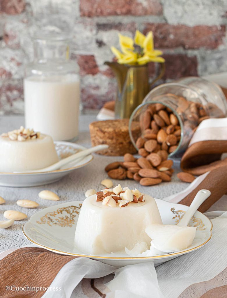 Zoals altijd bij gerechten met oude traditie bestaan er verschillende varianten van dit dessert. Ik volg een heel eenvoudig recept – maar geloof me, echt heel lekker – op basis van amandeldrank (of amandelmelk), gemakkelijk verkrijgbaar in elke supermarkt. De frisheid van deze bijzondere pudding, gecombineerd met de intense geur van amandelen en de delicate smaak, doet een waar wonder op het gehemelte en geeft een buitengewone voldoening. Probeer het en laat het me weten.