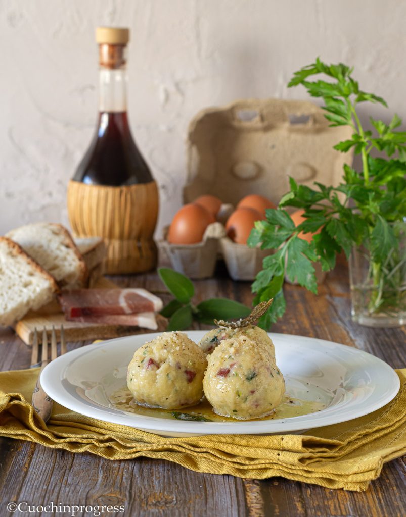 Het gaat om rustieke broodgnocchi, ronde van vorm, bereid met oud brood in kleine blokjes gesneden, speck in blokjes, eieren, melk en aromatische kruiden zoals peterselie en bieslook. Ze hebben een rustieke en hartige smaak dankzij de gerookte speck, in balans gebracht door het brood en de kruiden.