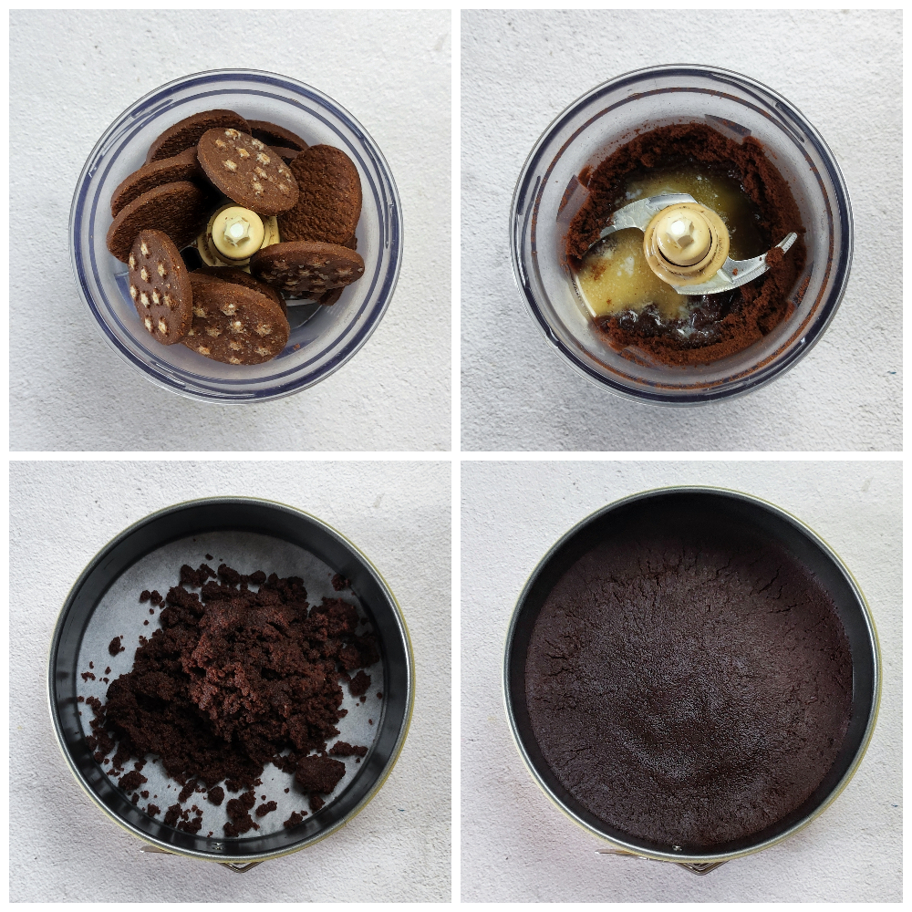 Smelt ondertussen de boter in een steelpannetje. Zodra de boter gesmolten is en de koekjes gemalen, meng je ze door elkaar en druk je het mengsel in een springvorm met losse rand van 18-20 cm waarvan de bodem bekleed is met bakpapier en de zijkanten met acetate of een strook bakpapier.