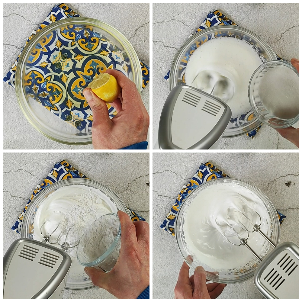 Doe de op kamertemperatuur gebrachte eiwitten in een kom met het citroensap en klop ze met de garde tot ze wit en luchtig worden.