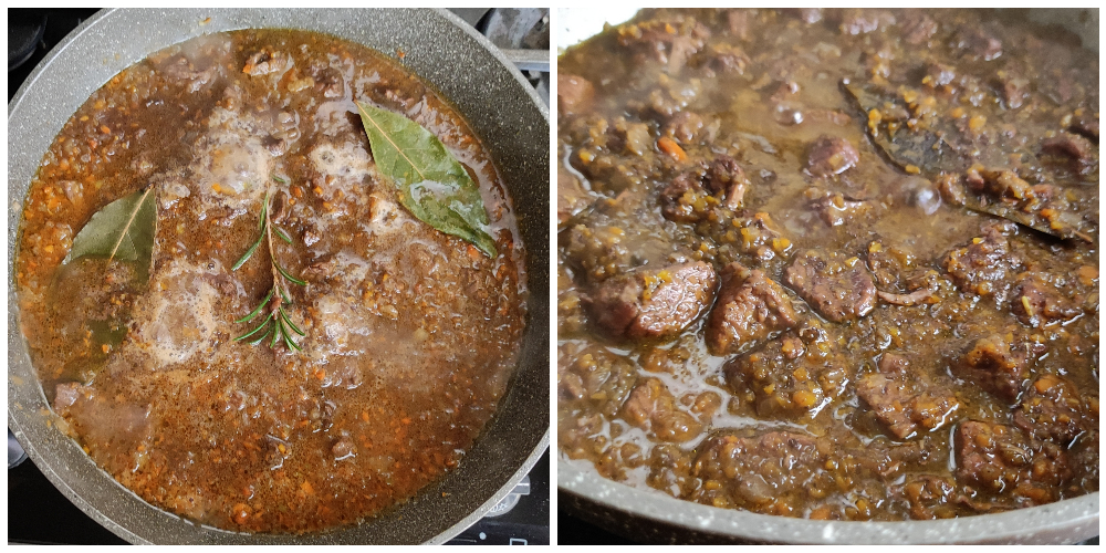 • Laat de stoofpot op laag vuur sudderen en voeg beetje bij beetje alle wijn toe, af en toe roerend. Reken op ongeveer 2 uur sudderen om het vlees mals te krijgen en de saus te laten inkoken tot een rijke textuur.
