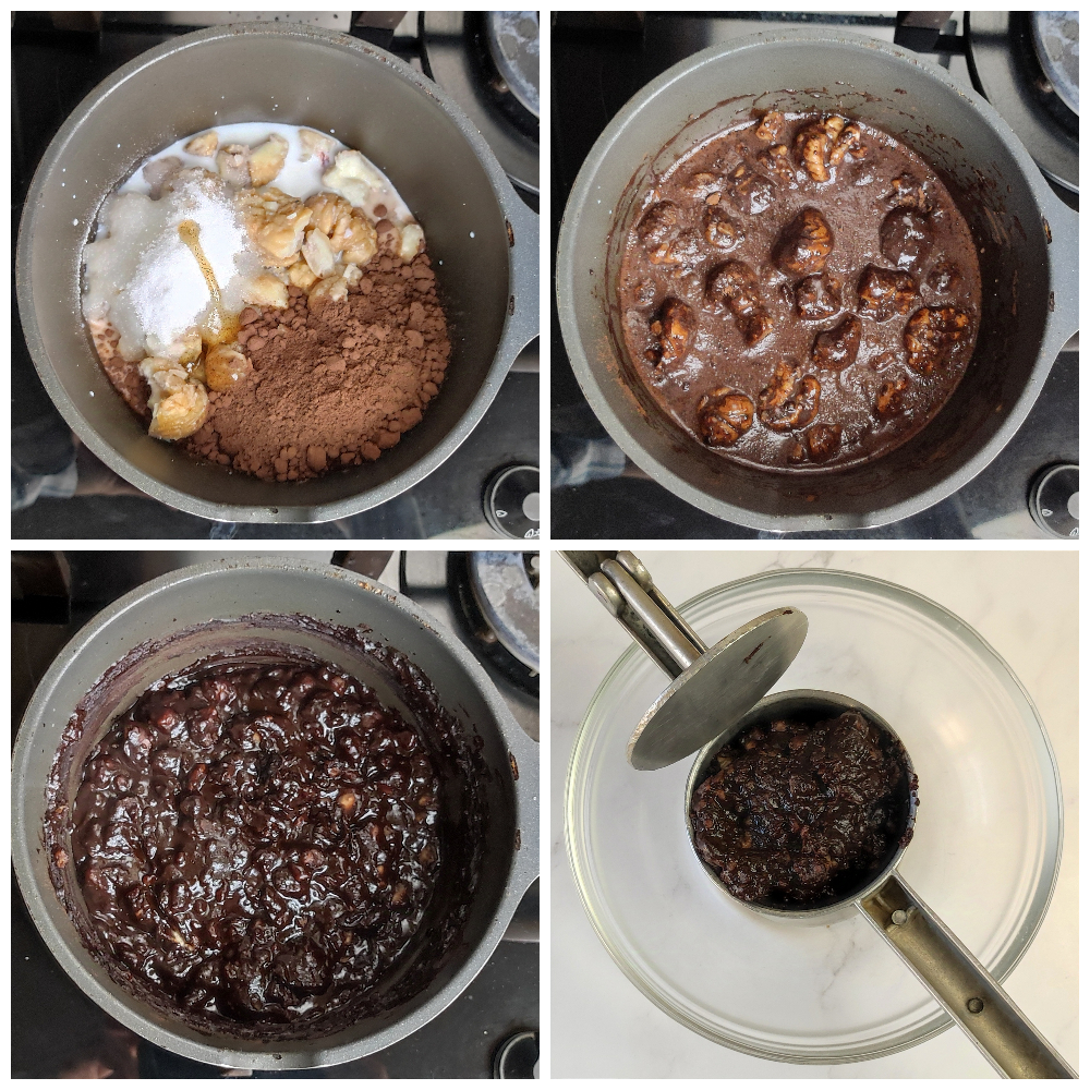 Als ze geschild zijn, doe je ze in een pan met de melk, de suiker, de vanille (doormidden gesneden) en het cacaopoeder. Laat alles zachtjes koken, voortdurend roerend, gedurende 15 minuten of totdat het mengsel goed is ingedikt.
