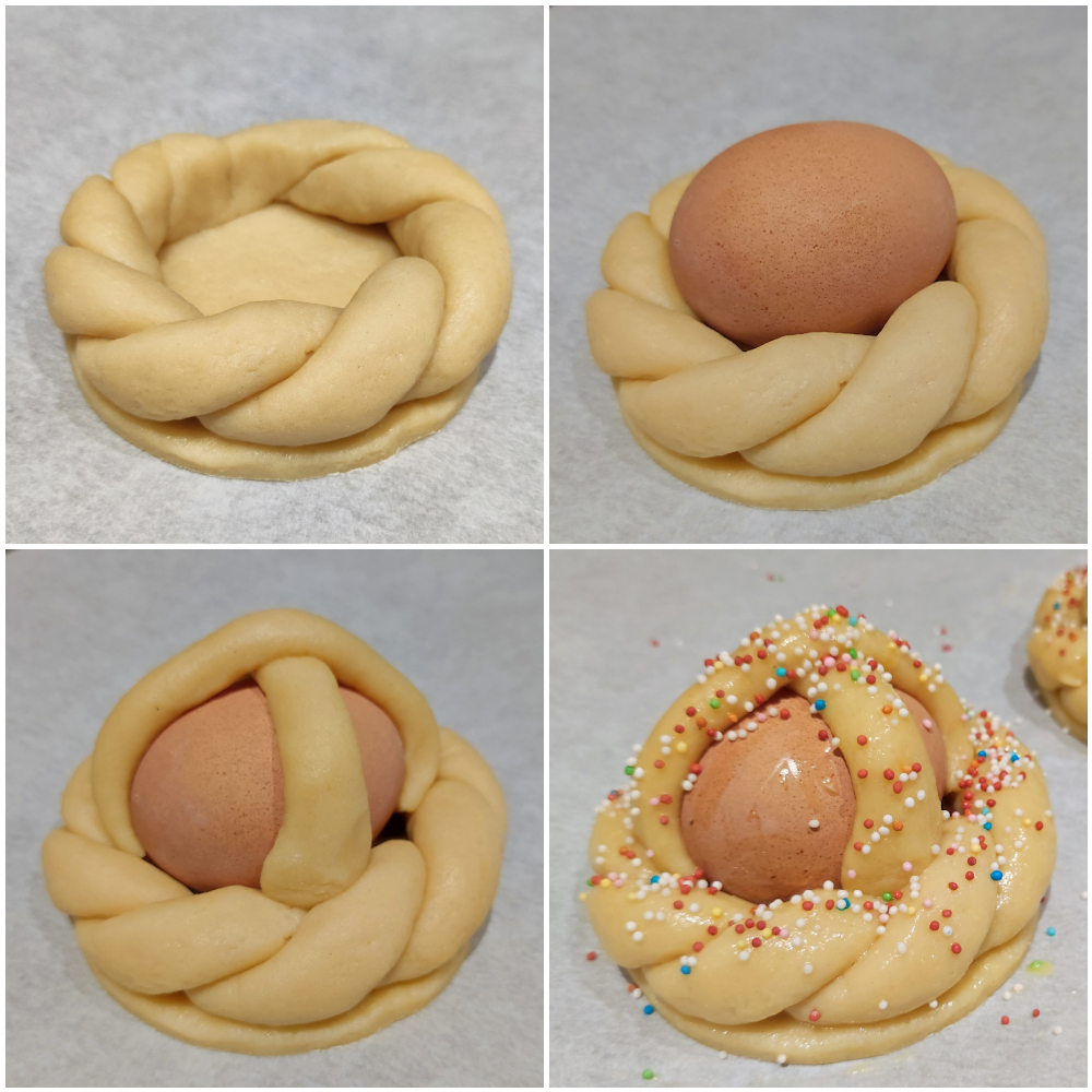 Bestrijk de cuddura met eieren met het losgeklopte ei gemengd met een scheutje melk, strooi de gekleurde suikerparels erop en bak in een voorverwarmde, statische oven op 180°C gedurende 30 minuten.