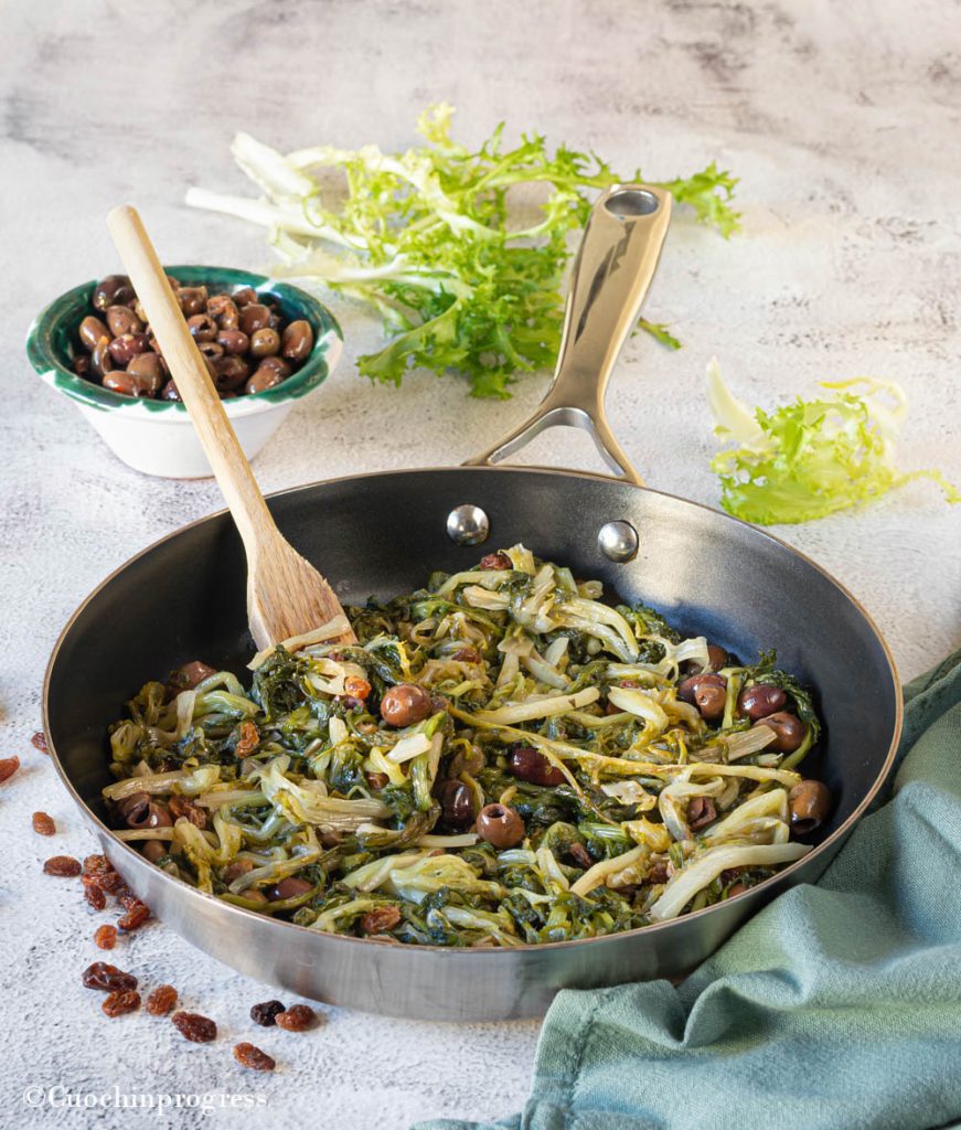 De ESCAROLE IN DE PAN is een bijgerecht met een authentieke smaak dat de rijkdom van de mediterrane keuken vertelt. Eenvoudig maar verrassend, in staat om zoete en hartige tonen in perfecte balans te verenigen.