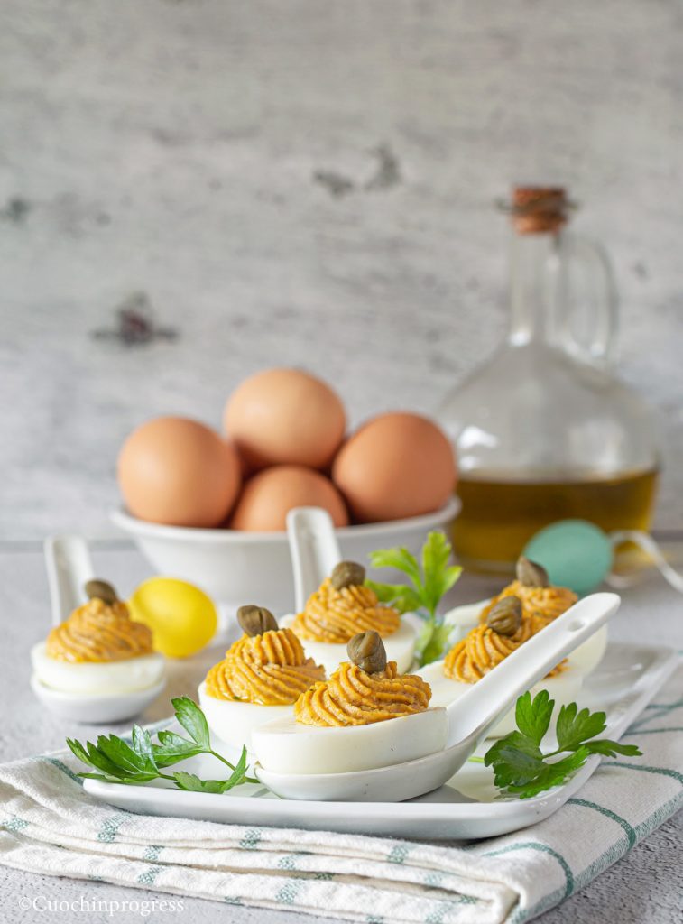 De GEVULDE EIEREN MET TONIJN, ANSJOVIS EN KAPPERTJES zijn een eenvoudig maar heel smakelijk voorgerecht uit de familietraditie, bekend over de hele wereld en vooral geserveerd tijdens de paasdagen, wanneer de eieren een wens voor leven en geluk symboliseren. Ze zijn in enkele minuten te maken, zonder enige moeite, en zijn daarom ook een zeer handig gerecht wanneer je veel gasten verwacht.