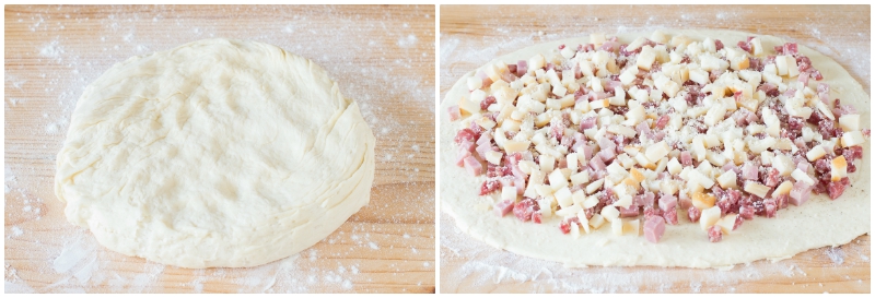 Na 2 uur, wanneer het deeg in volume is verdubbeld, rol je het met de deegroller uit tot een dikte van ongeveer 0,5 cm, totdat je een rechthoekige plak krijgt.