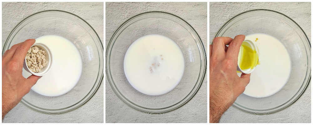 Doe in een ruime kom (of in de kom van de keukenmachine met de spiraalhaak) de lauwe melk en het water en los daar de bakkersgist in op. Voeg de olie toe, de bloem beetje bij beetje en begin te kneden tot je een zacht maar samenhangend deeg krijgt.