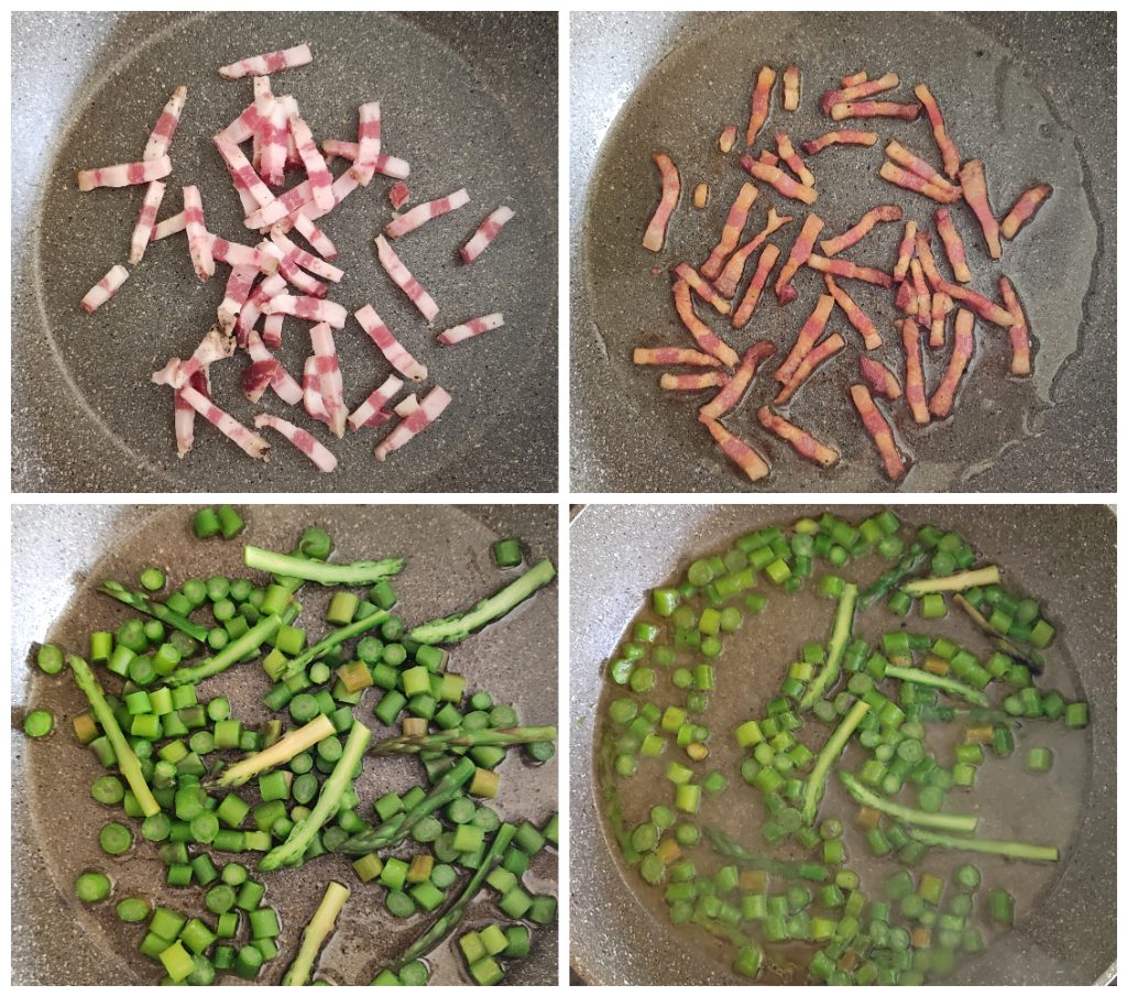 Bak het krokant en laat uitlekken op keukenpapier. Voeg in de pan met het vet van de guanciale de asperges toe en laat ze op smaak komen. Voeg vervolgens het water toe waarin je de asperges hebt gekookt en laat 5 minuten sudderen.