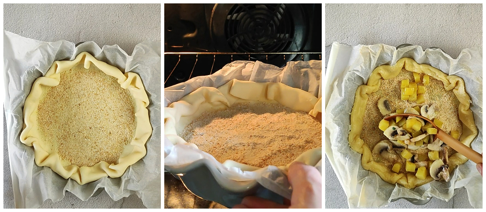 Druk het goed tegen de wanden aan, vouw de randen naar binnen, prik de bodem in met een vork en bestrooi met paneermeel.