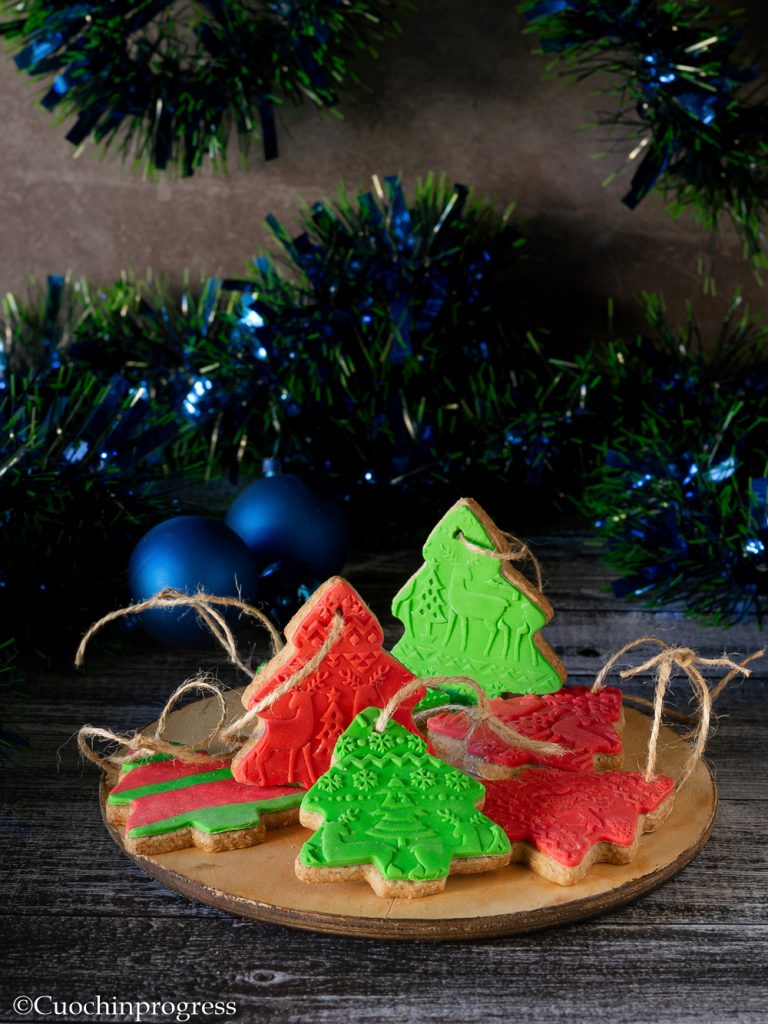 Als het fondant droog is, haal je een lint of raffia door het gaatje van elk koekje; daarmee kun je ze aan de kerstboom hangen.