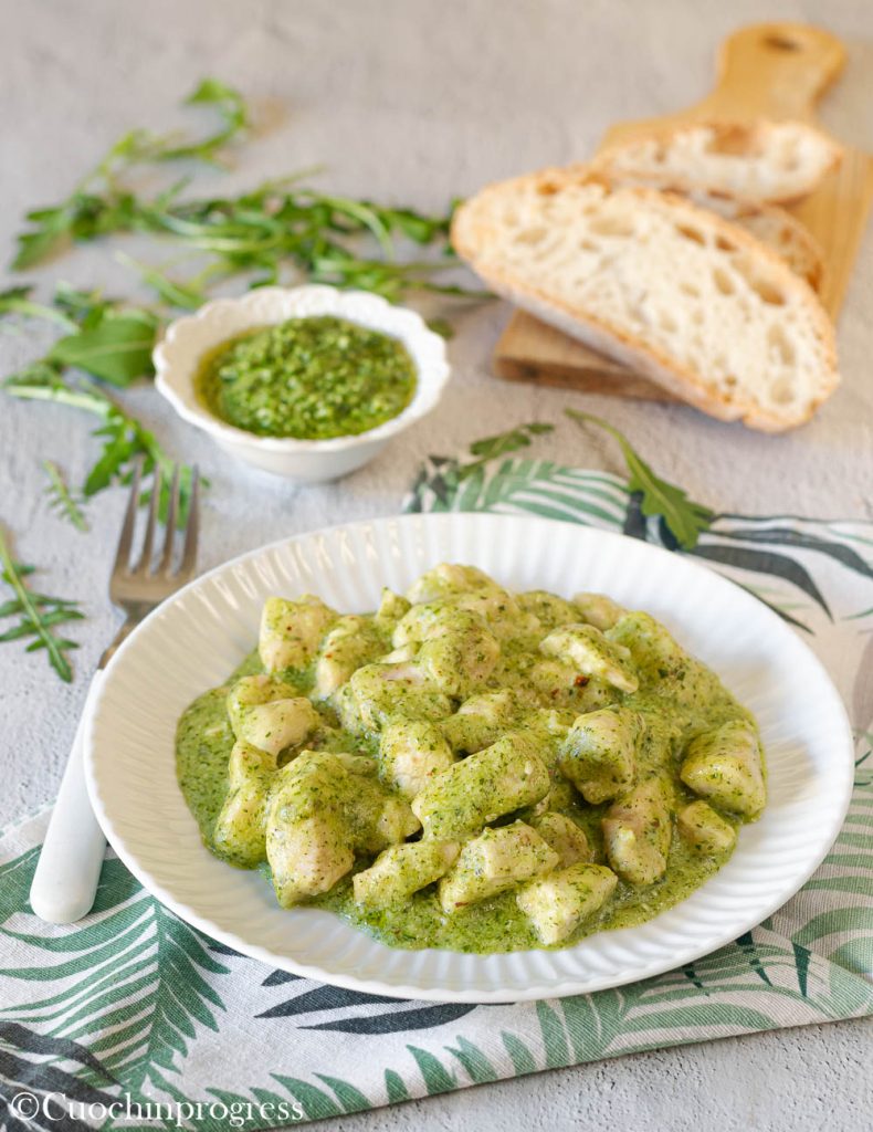 • Zet het vuur uit, schep op de borden en geniet van uw warme en romige kipblokjes met rucolapesto.