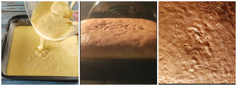Boter en bestuif een vierkante bakvorm van 22×22 cm, of gebruik een ronde vorm, giet het beslag erin en bak in een voorverwarmde, niet-ventilerende oven op 180°C gedurende 35 minuten.