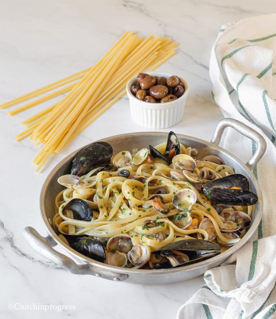 De LINGUINE MET MOSSEN, VENUSSCHLEPEN EN OLIJVEN zijn een uitstekend zeevruchtengerecht als eerste gang, heel smaakvol en perfect als hoofdgerecht bij een zomerse lunch. Het is een gerecht uit de mediterrane traditie, aanwezig in veel regio’s van ons land, eenvoudig te bereiden maar zo lekker dat het altijd iedereen tevreden stelt. Natuurlijk bestaan er veel varianten, maar degene die ik je voorstel, goed beproefd, is werkelijk in balans en perfect.