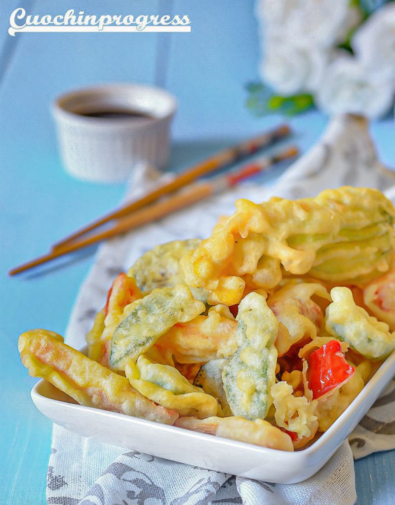 Haal de groenten één voor één door het beslag, bij voorkeur dun gesneden in reepjes, en dompel ze vervolgens in de hete olie met een tang. Ze moeten goudbruin en krokant worden, niet aangebrand of verbrand.