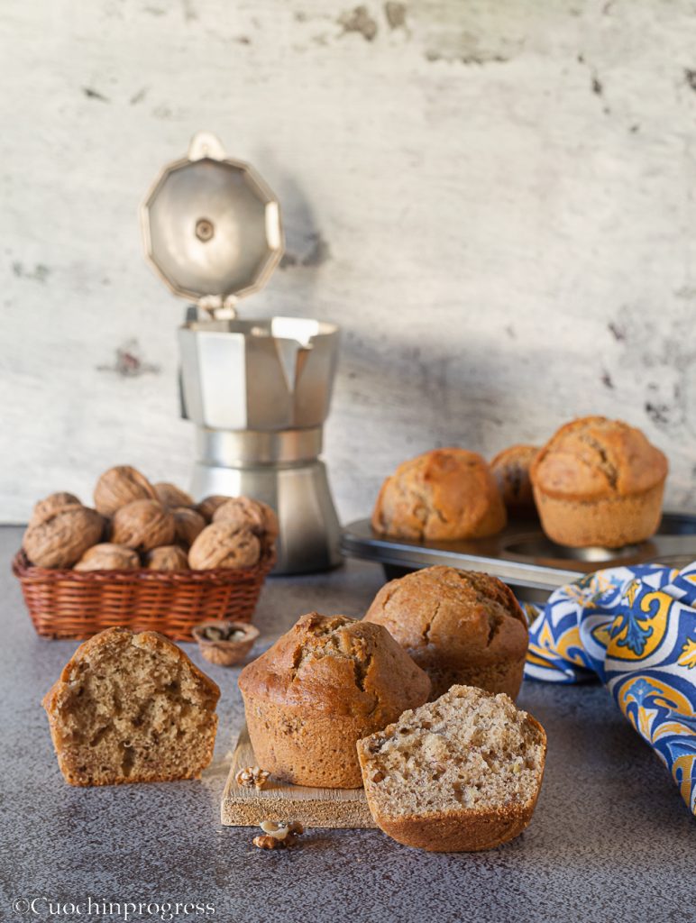 DE MUFFINS MET BANAAN, KOFFIE EN WALNOTEN zijn zachte cakejes met een volle smaak en een uitgesproken geur, van Amerikaanse oorsprong maar lichter qua vetten, perfect om bij het ontbijt te serveren wanneer je de opkikker van koffie en de energie van banaan en walnoten nodig hebt, voedingsmiddelen die ideaal zijn om de dag goed te beginnen. Natuurlijk kun je deze muffins ook op andere momenten van de dag eten, telkens wanneer je een energie-dip hebt of, eenvoudiger gezegd, wanneer je zin hebt in iets lekkers.