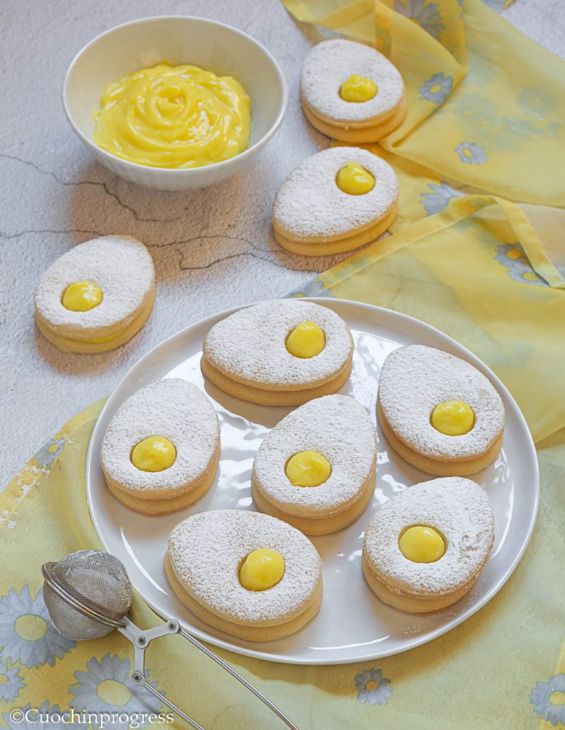 Volgens de traditie is het ei een paassymbool: het uiterlijk dat aan stenen doet denken doet het lijken alsof het levenloos is, zoals een graf afgesloten door een steen, maar van binnen bevat het leven, dat het beeld van de verrijzenis wordt. In deze koekjes wordt dit alles eenvoudig opgeroepen: twee knapperige zanddeegkoekjes bevatten een delicate banketbakkersroom die naar buiten komt door de inkeping in het bovenste koekje. Het maken ervan is dus echt eenvoudig en vereist alleen een uitsteekvorm in ei-vorm, die vervangen kan worden door met bakpapier gemaakte sjablonen die gemakkelijk thuis te maken zijn.