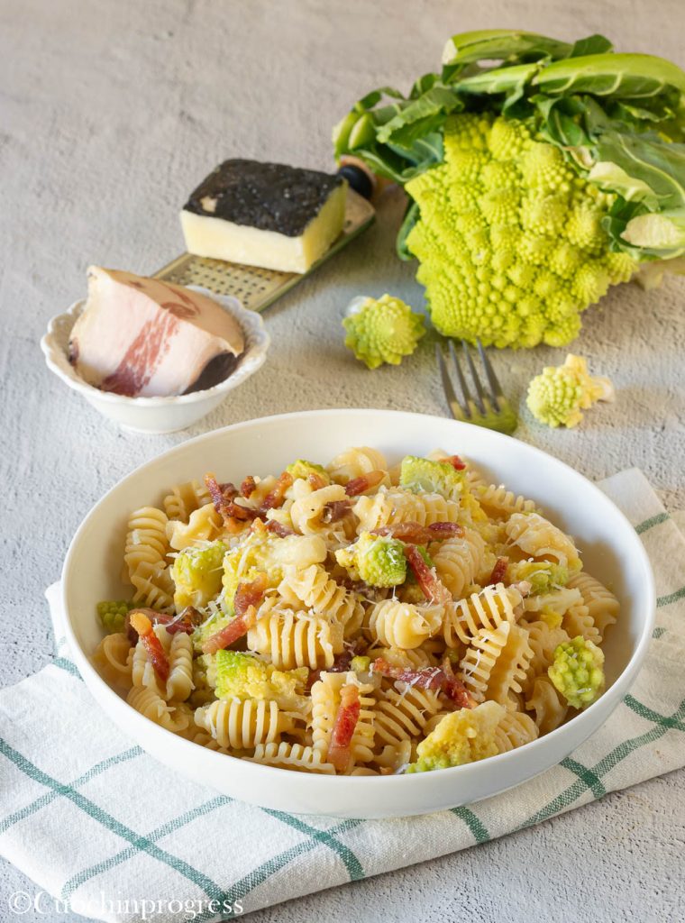 Het recept vraagt om het garen van de romanesco-broccoli, die wordt geblancheerd zodat hij mals maar nog steeds stevig blijft, en vervolgens kort in de pan wordt gesauteerd met het vet van de guanciale dat het gerecht een rijke en warme smaak geeft. De broccoli en krokante guanciale worden daarna gemengd met de pasta, bij voorkeur korte pasta (zoals radiatori, rigatoni, mezze maniche of fusilli), zodat de smaken zich perfect kunnen vermengen.