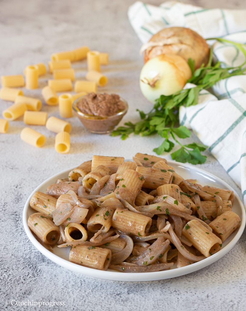 Het gerecht ontstaat door de combinatie van twee heel verschillende smaken die perfect samengaan: de hartigheid en de licht bittere smaak van de olijventapenade past namelijk uitstekend bij de zachte zoetheid van gestoofde uien, die door langzaam bakken in de pan zacht maar nog knapperig blijven. Het levert een perfecte saus voor de pasta op (bij voorkeur korte pasta die de saus goed opneemt), geurig, smaakvol en erg verleidelijk.