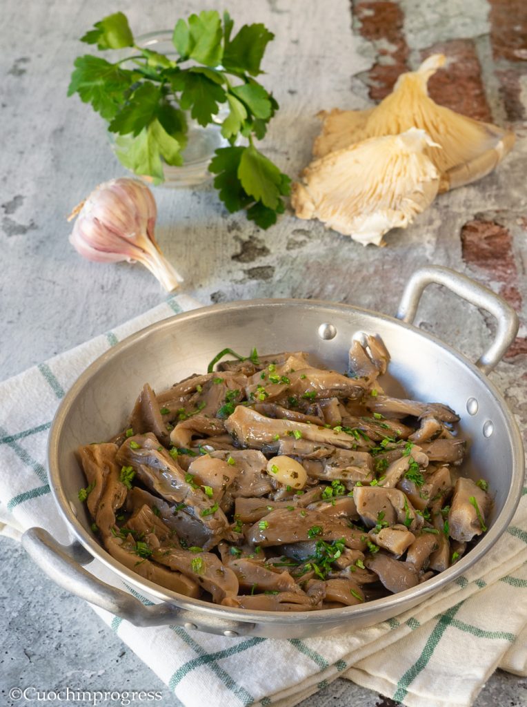 Het bijzondere van dit bijgerecht ligt in de eigenschappen van de pleurotus-paddenstoelen die, in tegenstelling tot andere types, zelfs meer geroemde, een buitengewone vlezigheid hebben die behouden blijft na het koken, waardoor ze bijzonder aangenaam zijn om te eten. Bovendien versterkt het eenvoudige aroma van knoflook en peterselie, dat vooral aan het einde van de bereiding royaal toegevoegd moet worden, de delicate maar werkelijk heerlijke smaak van deze paddenstoelen.