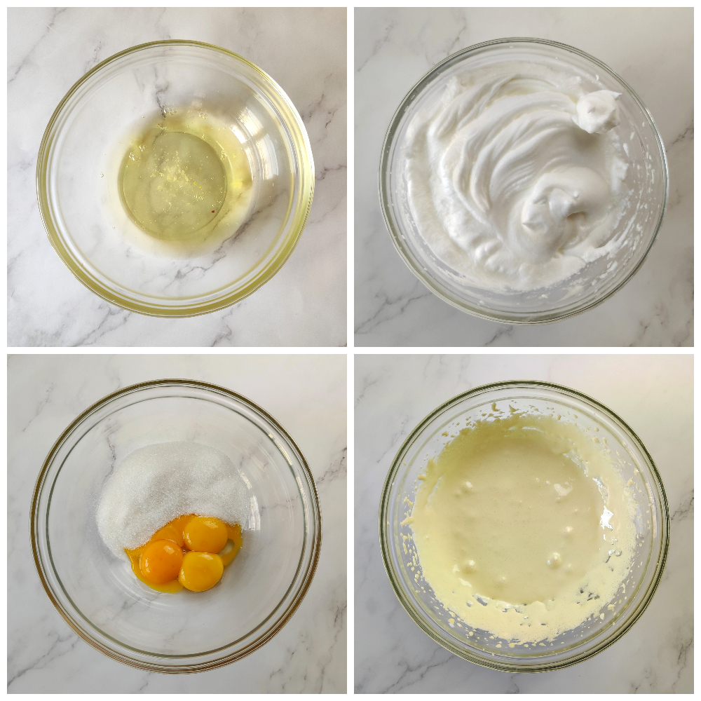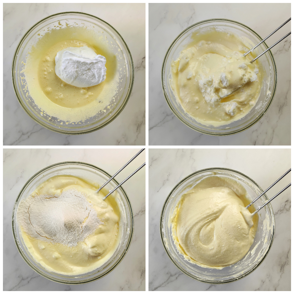 Voeg het eiwit in twee porties toe aan de eidooiers en meng heel voorzichtig met een spatel.
