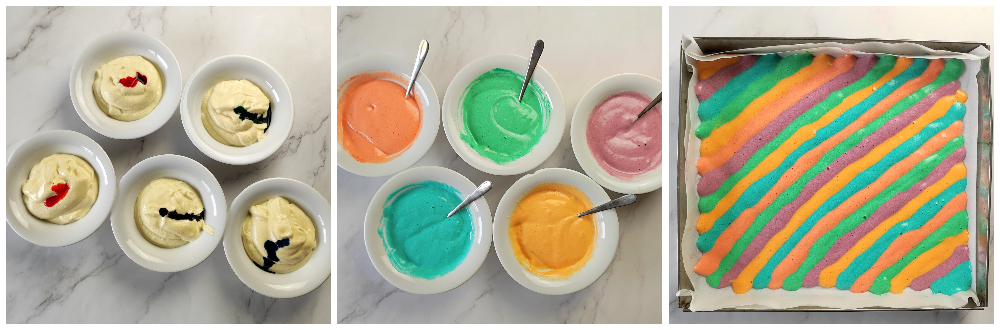 Doe vervolgens de gekleurde beslagdelen in 5 spuitzakken. Maak licht vochtig een rechthoekig bakblik 29×33 cm, bekleed het met bakpapier en laat het strak aansluiten.