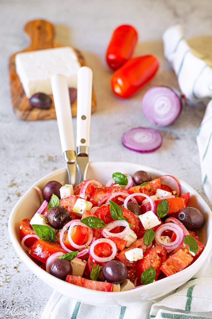 De SALADE TOMATEN FETA EN OLIJVEN, vergelijkbaar met de Griekse maar zonder komkommer en paprika, is een licht gerecht, ideaal om het hele jaar door te eten maar vooral in de zomer, wanneer men trek heeft in frisse, smaakvolle en gemakkelijk te bereiden gerechten. Het hoofdingrediënt van deze salade is feta, de bekendste Griekse kaas, die zich onderscheidt door zijn licht zure en zoute smaak, met een compacte maar toch brokkelige textuur. Gemakkelijk en snel recept; deze salade kan worden gegeten als vrolijk voorgerecht, bijgerecht bij een hoofdgerecht of, in de juiste hoeveelheden, als hoofdgerecht.