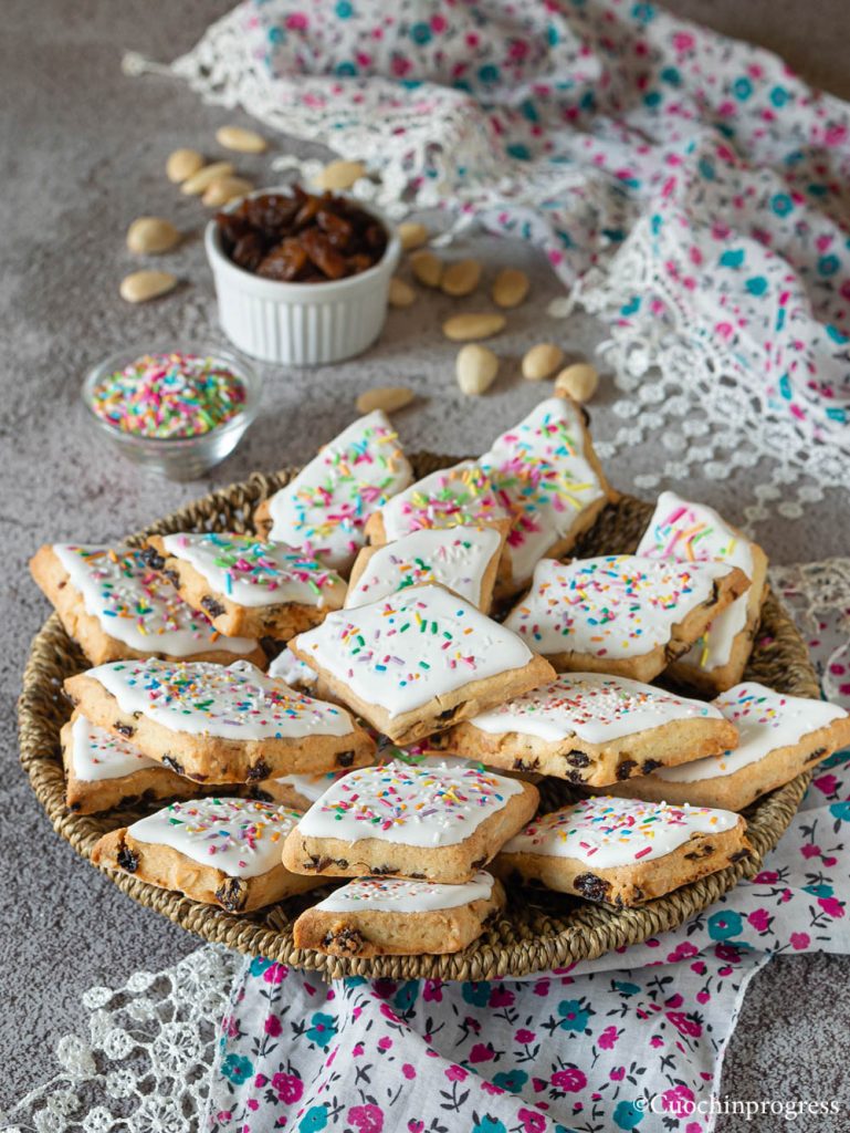 Zoals bij alle traditionele recepten zijn er talloze varianten, van noord tot zuid van het eiland. Ik koos voor een eenvoudige maar zeer smakelijke versie, die een waar feest van smaken garandeert en verschillende texturen biedt terwijl je het koekje eet, met veel voldoening. Amandelen, sinaasappelschil en natuurlijk rozijnen worden gecombineerd in een smakelijk deeg en verzacht door een suikerlaagje dat ik op smaak bracht met anijs, om de koekjes een speciale smaak en een vrolijk uiterlijk te geven, echt passend bij de feestdagen.