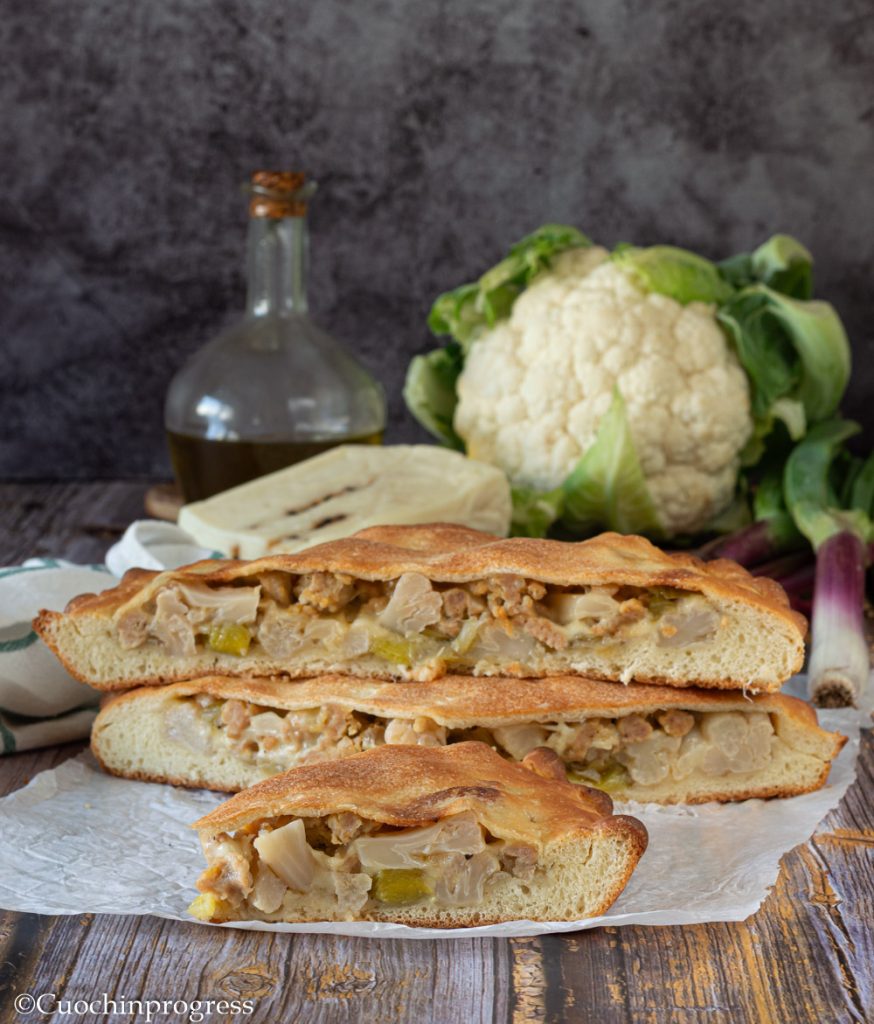 De SCACCIATA MET BLOEMKOOL, SAUCIJS EN TUMA is een waar eerbetoon aan de rustieke en authentieke smaken van Sicilië.