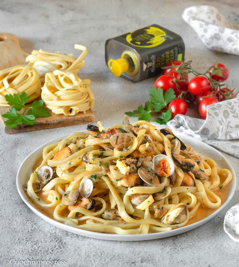 Het bereiden van dit recept vraagt geen moeite, maar wel dat je kiest voor ingrediënten van goede kwaliteit. Venusschelpen, mosselen en grote gamba’s maken echt het verschil, samen met cherrytomaatjes, knoflook, extra vierge olijfolie en peterselie, die de mediterrane invloed in de keuken van Campanië weerspiegelen.
