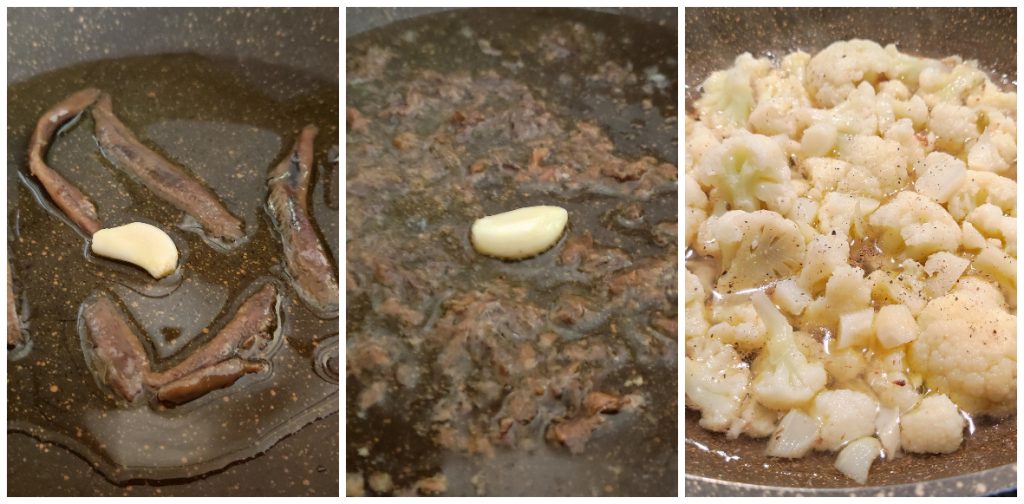 Verhit in een pan een scheut olie en laat de knoflook op laag vuur zachtjes bakken. Voeg de ansjovisfilets toe en laat ze op laag vuur smelten. Voeg de in stukjes gedeelde bloemkool toe, twee soeplepels van het kookwater en laat het 10 minuten sudderen of totdat het zacht is.
