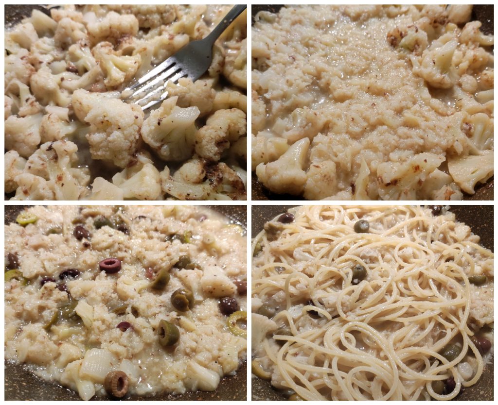 • Prak met een vork de helft van de bloemkool zodat je een romige saus krijgt, voeg de olijven toe en laat nog 2 minuten koken.