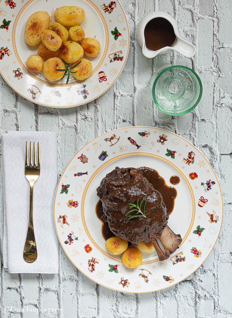 Leg de varkensschenkel op het bord, bedruip met de saus en serveer met de geroosterde aardappelen.