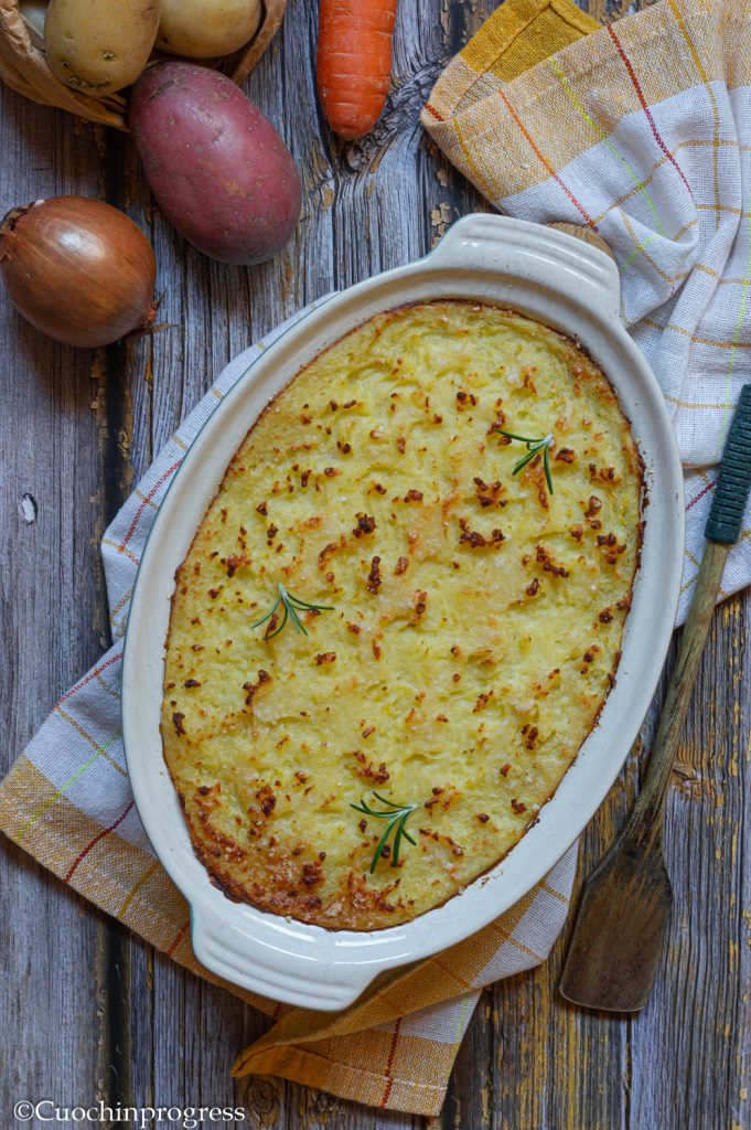 De pastei wordt vervolgens in de oven gebakken tot hij goudbruin is, waardoor er een knapperig korstje ontstaat bovenop de puree dat prettig contrasteert met de sappige vleessmaak van de vulling. Het is een compleet, rijk en smakelijk gerecht dat op zichzelf kan worden geserveerd of vergezeld kan gaan van een eenvoudige salade voor wat frisheid.