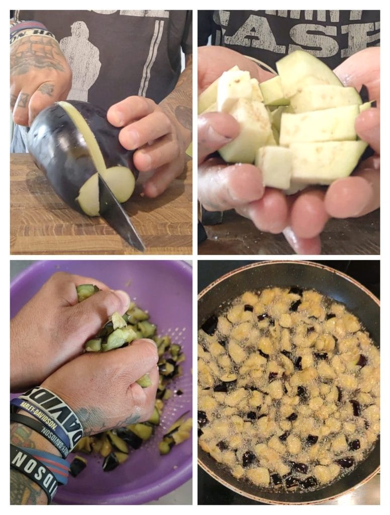 Allereerst, om de anelletti uit de oven met aubergines te maken, heb ik de aubergines ontdaan van de uiteinden, in tweeën gesneden, vervolgens in blokjes en na ze een half uur in zout te hebben gelegd, heb ik ze gespoeld, gedroogd en gefrituurd in overvloedige zonnebloemolie.