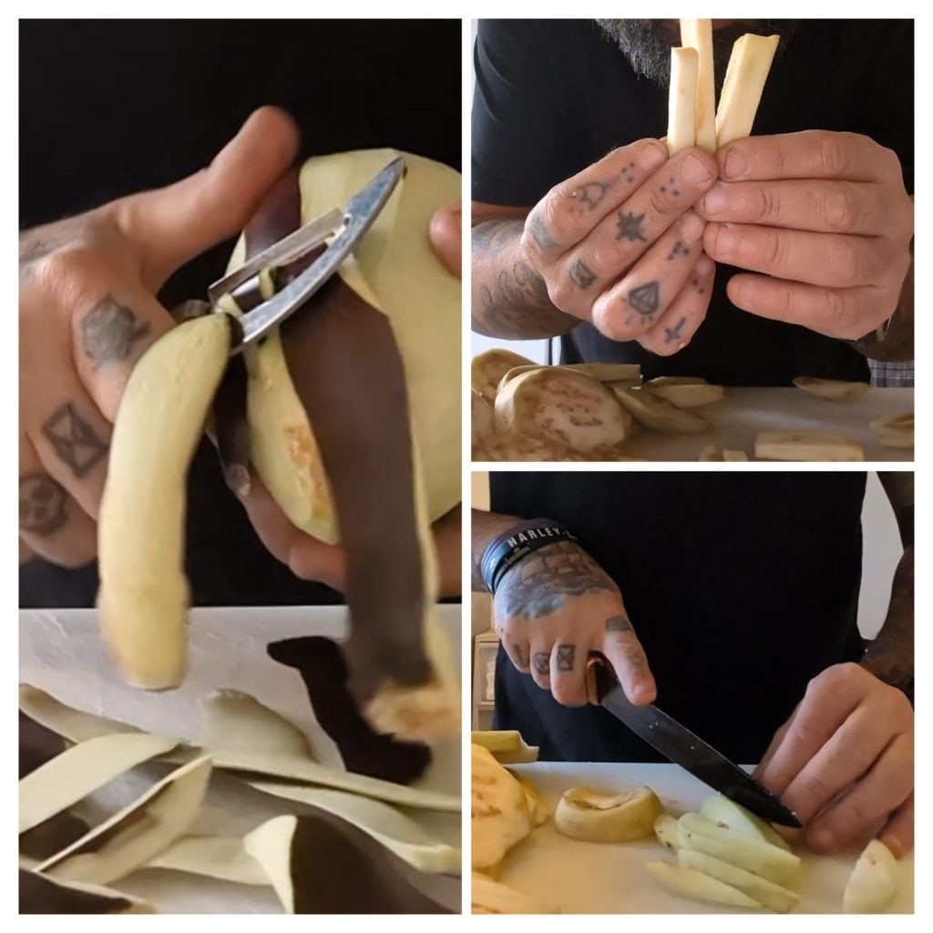 Om de aubergines op olie volgens het recept van oma te bereiden, beginnen we met het verwijderen van de schil van de aubergines. Vervolgens snijden we de aubergines eerst in plakken en dan elke plak in reepjes. Je kunt de dikte kiezen die je verkiest