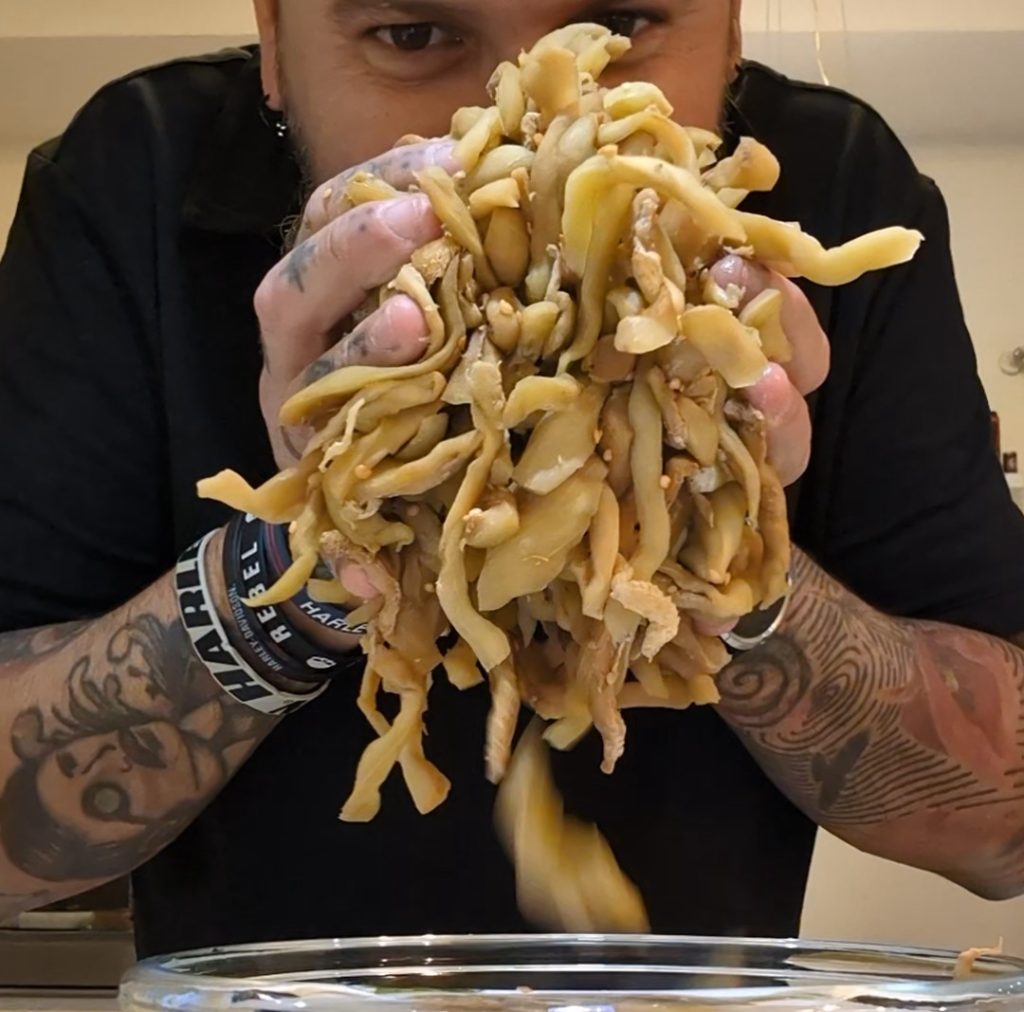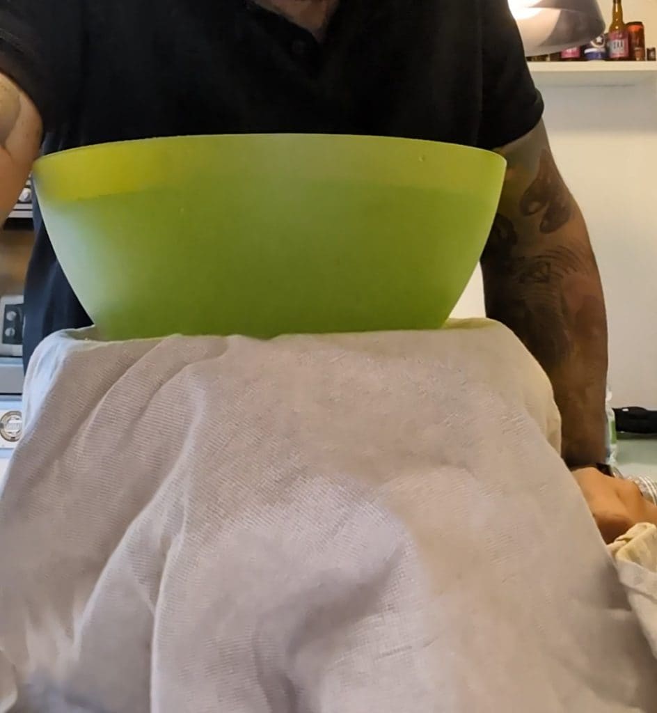 Daarna gaan we een pekelen maken voor 24 uur waarbij we een gewicht gebruiken om alle aubergines goed aan te drukken, zodat er zoveel mogelijk water uit komt.