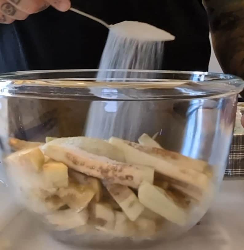 Nu, nadat we alle aubergines in reepjes hebben gesneden, leggen we ze in een grote kom zodat deze alle vloeistof kan bevatten die wordt vrijgegeven nadat we ze laag voor laag gezouten hebben totdat de kom vol is.