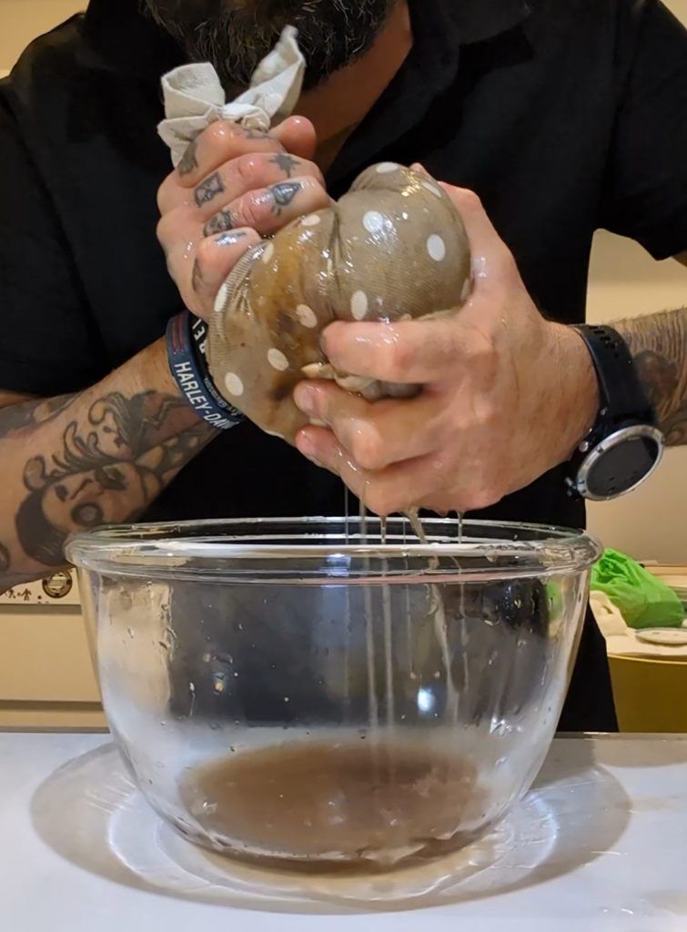 Na de aubergines 24 uur in de pekel te hebben gelaten, halen we ze eruit en knijpen we ze goed uit om alle overgebleven water te verwijderen. Je kunt een handdoek, een aardappelpers of zelfs met de hand gebruiken als je een sterke grip hebt. Het belangrijkste is dat de aubergines volledig droog zijn.