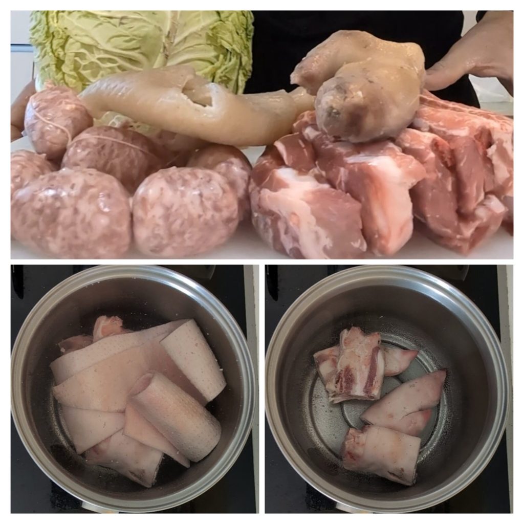 Vervolgens voegen we de soffritto van groenten toe samen met al het vlees: de ribbetjes, de worstjes, de poot en het zwoerd. We bakken het geheel enkele minuten, voordat we de witte wijn toevoegen om te blussen.