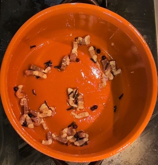 Nu, in een pot, bij voorkeur van aardewerk zoals de traditie het wil, bakt u de spek uit met de kruidnagels, de zwarte peperkorrels en de jeneverbessen.