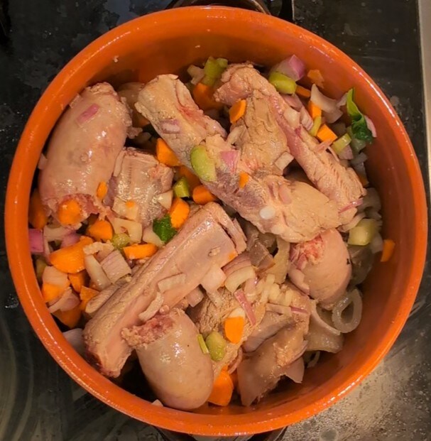 Dan bedekken we alles met de vleesbouillon of, als alternatief, kan heet water ook, met misschien een bouillonblokje. Het belangrijkste is dat we alle ingrediënten bedekken zodat een gelijkmatige garing wordt bereikt.