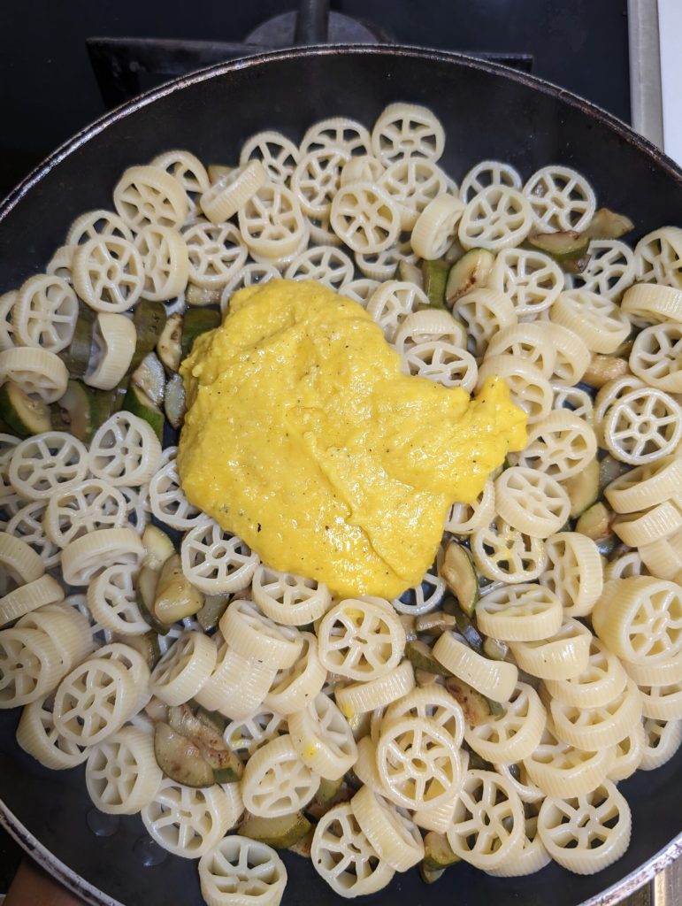 Zodra de pasta gaar is, giet deze dan af en meng deze al dente met de gebakken courgettes in een schone pan. Laat een paar minuten sauteren, alleen de tijd om te kruiden. Ondertussen, klop in een kom de eidooiers met de geraspte pecorino en een snufje peper.