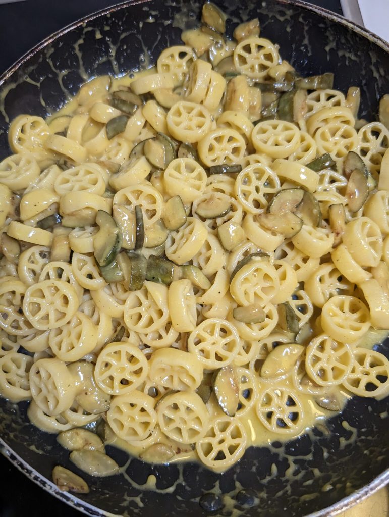 Meng de pasta, de courgettes en de saus buiten het vuur, of op de pan met het pastawater dat uit staat voor 3-5 minuten nadat je de pasta hebt afgegoten met een pollepel. Als je geen kakelverse eieren hebt gebruikt, pasteuriseert deze operatie de eieren.
